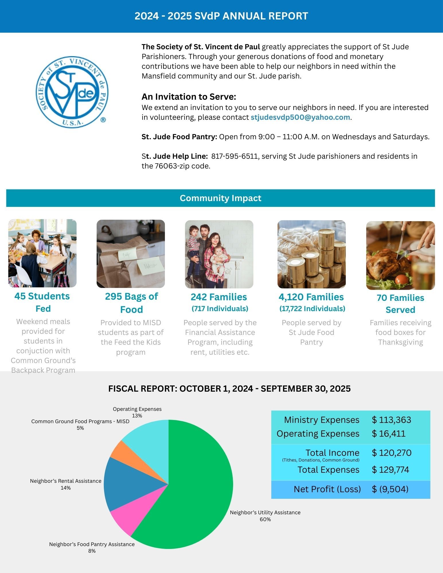 The Society of St. Vincent de Paul greatly appreciates the support of St Jude Parishioners. Through your generous donations of food and monetary contributions we have been able to help our neighbors in need within the Mansfield community and our St. Jude parish. From October 2023 through September 2024, the SVdP’s Financial Assistance program has served 199 families (616 individuals) in need of assistance with their rent, utilities, etc. The St Jude Food Pantry was able to provide food supplies for 3,598 families (15,376 individuals). In November, 70 families also received food boxes to prepare their Thanksgiving dinners. During the school year, in conjunction with Common Ground’s Backpack Program we provided weekend meals for 40 designated MISD students. During their summer Feed the Kids program, we provided 512 bags of food (each with 7-8 meals/week) to MISD students.